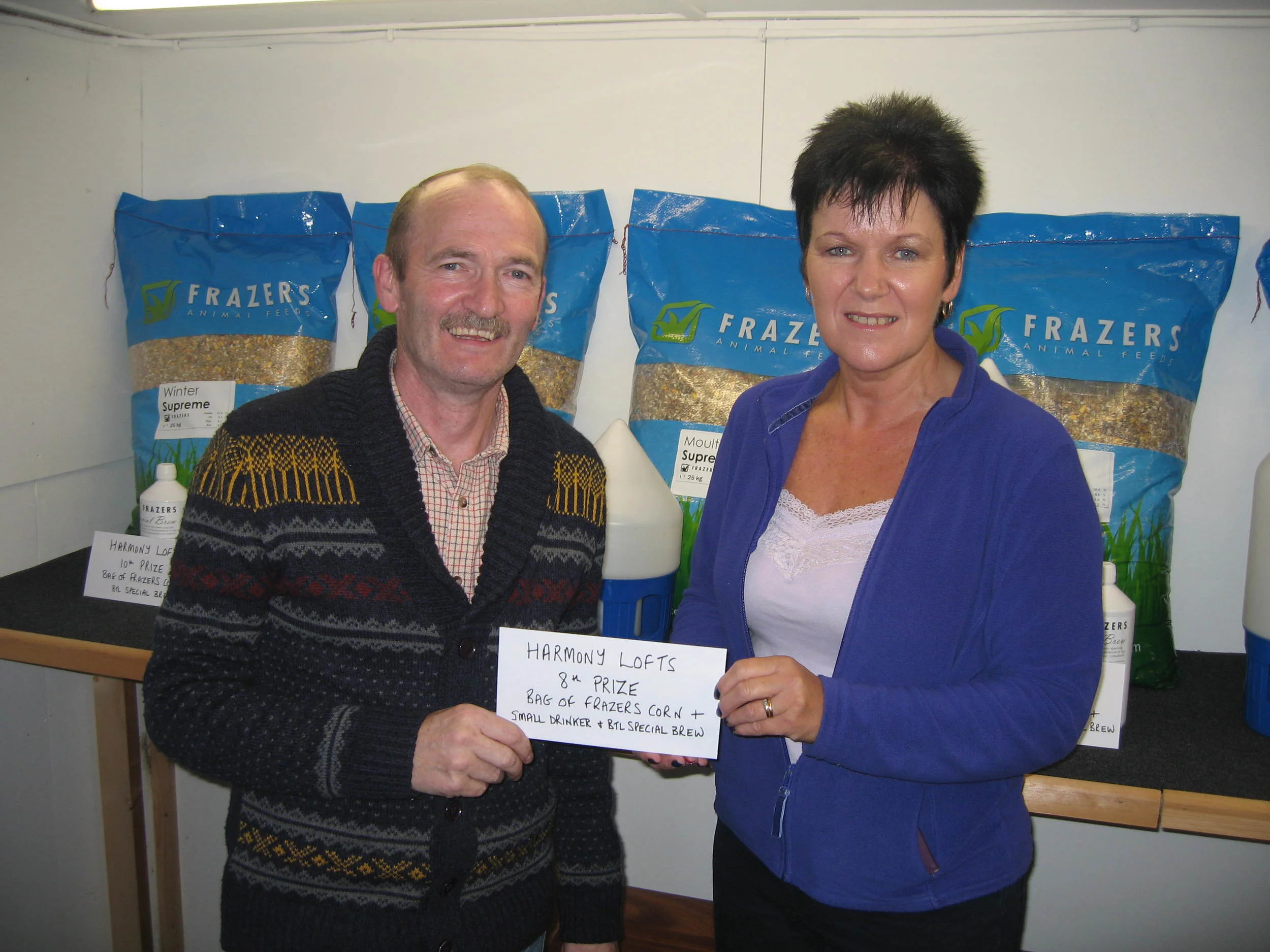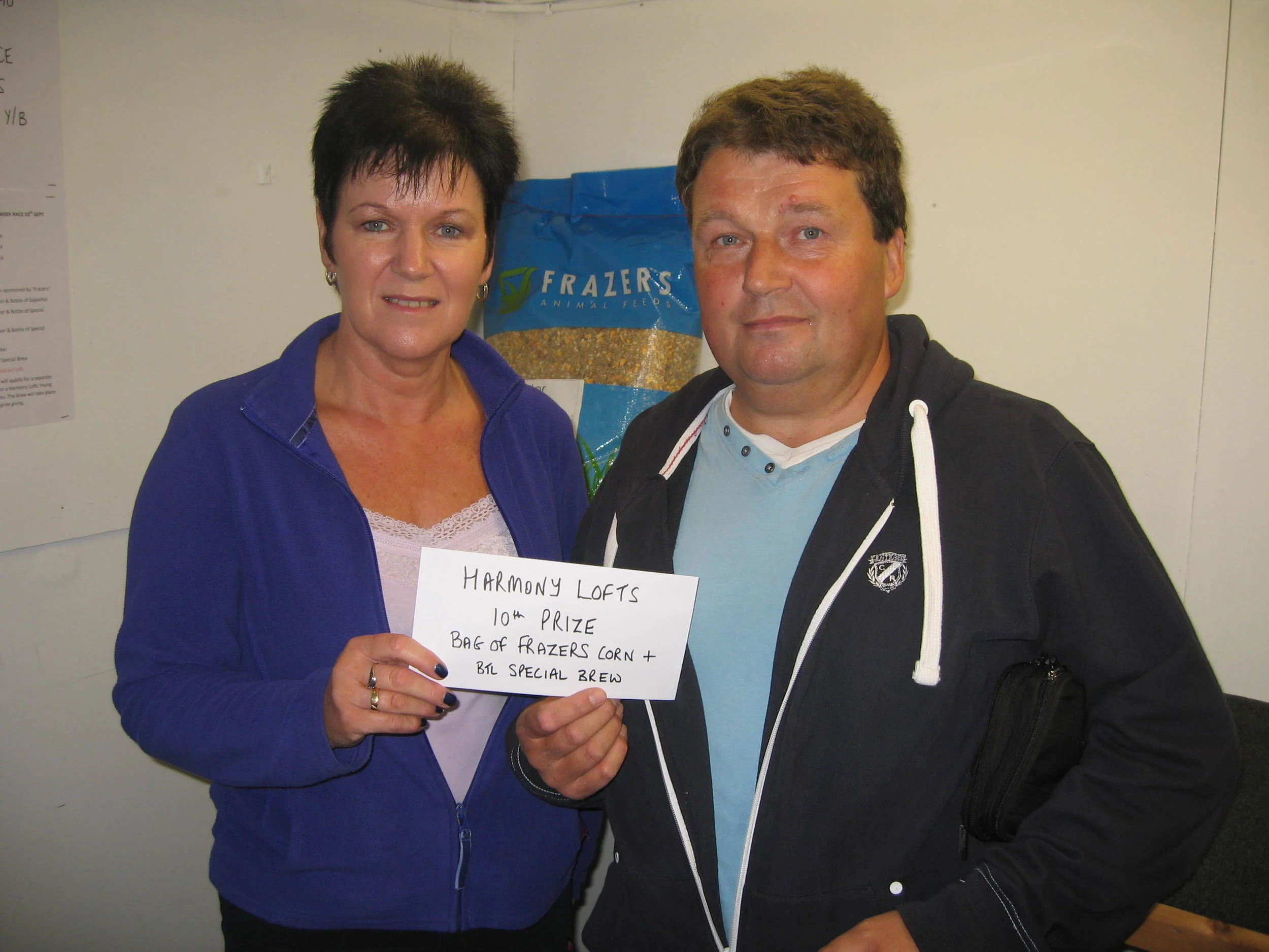 Viv congratulates Gregory and Ellen McEvoy from Beechpark Club on winning 7th and 9th prize. Gregory's winning bird was a Harmony Lofts Leo-Van-Rijn. Collecting 2 bags of Frazers corn, 2 drinkers and a bottle of Special Brew.